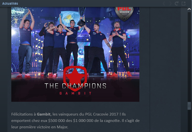 Ce message était en page d'accueil du jeu lorsque Gambit Gaming a gagné le PGL Major, 11ème Major de l'histoire du jeu, qui a eu lieu en juillet 2017.