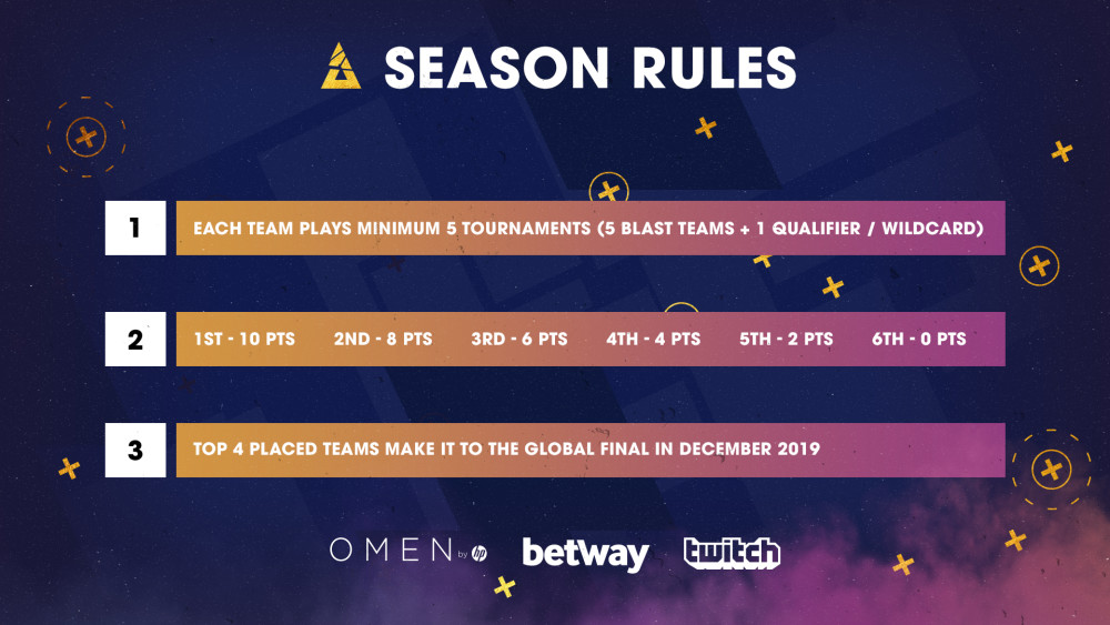 Pour se départager, sept équipes, Astralis, Team Liquid, FaZe, Ninjas in Pyjamas, Made in Brazil, Na'Vi et Cloud9 recevront un certain nombre de points en fonction de leur position à chaque édition. Un classement global déterminera ensuite le rang de chaque line-up. L'équipe qui terminera première d'un tournoi empochera 10 points alors que la dernière repartira bredouille. Le nombre de participants étant de six, chaque étape verra s'affronter cinq des sept équipes de la liste ci-dessus ainsi qu'une sixième qui se sera qualifiée ou qui aura reçu une invitation. Pour assurer un équilibre, chaque équipe en lice se présentera à un maximum de cinq tournois.