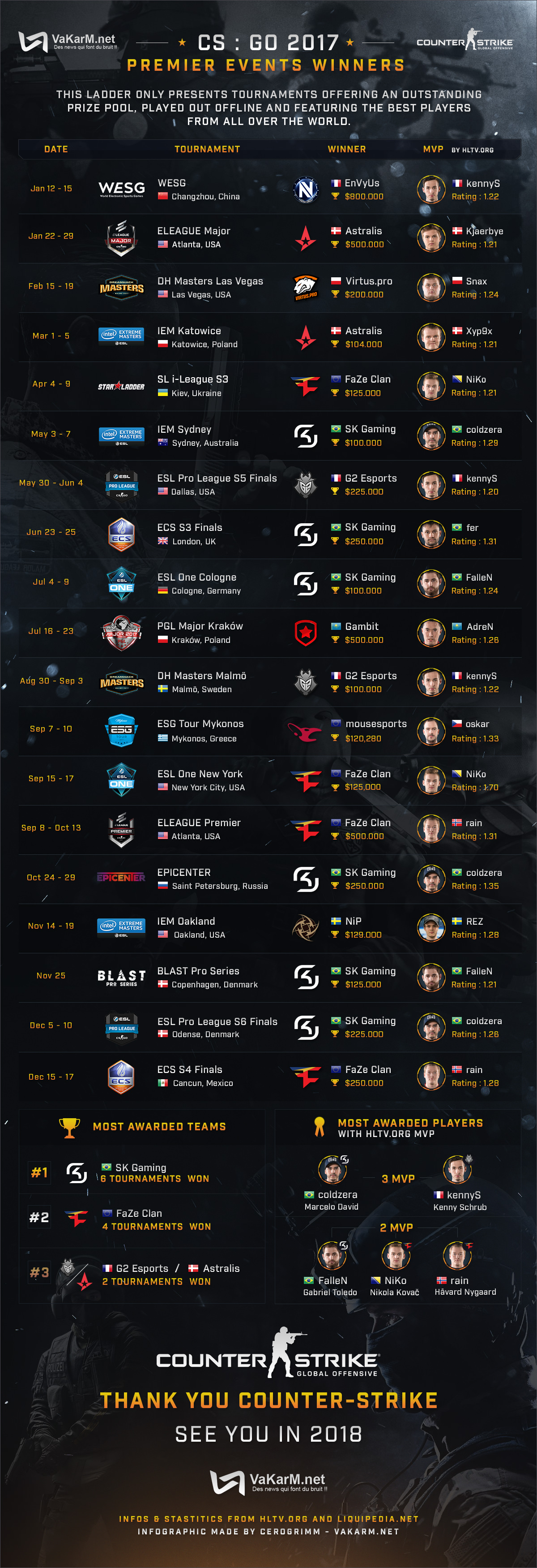 31 Et une de plus ! Cinq bougies soufflées pour CS:GO en 2017 et une scène compétitive toujours aussi vaillante, qui fourmille de tournois aux cashprizes à six chiffres. L'année aura été riche en lans et le temps est venu de voir qui se sera le mieux débrouillé pour aller soulever les trophées les plus prestigieux. Du Brésil au Danemark, de la France à l'Europe, de la Suède à la Pologne, tout le monde, ou presque, aura eu droit à son heure de gloire.