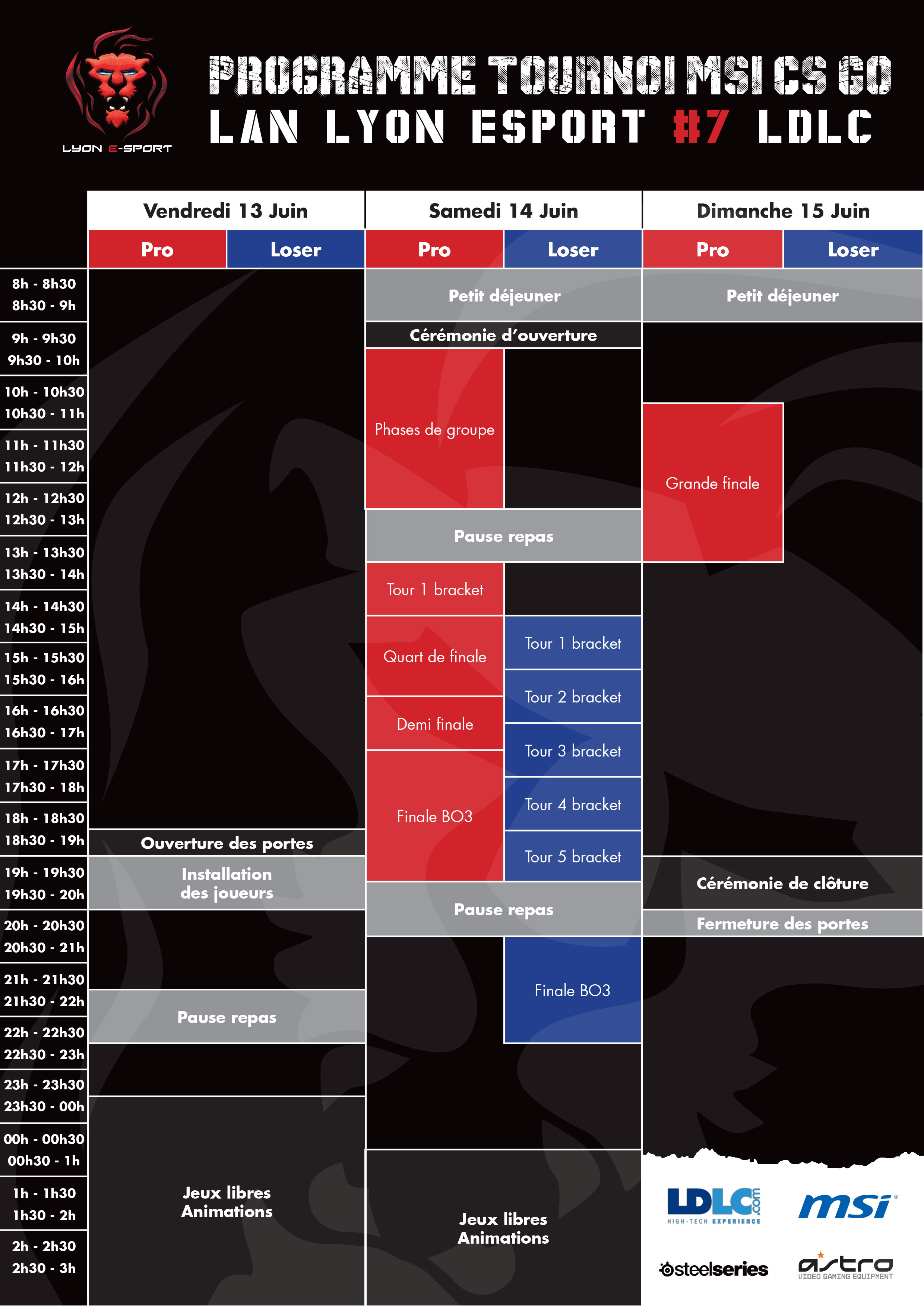7 Le week-end s'annonce chargé du côté de Lyon. Avec 32 slots, le tournoi ne devra pas prendre trop de retard et les organisateurs ont donc mis en place et partagé un planning détaillé. Les joueurs seront accueillis vendredi à partir de 18h30 et pourront s'installer dans la nuit.