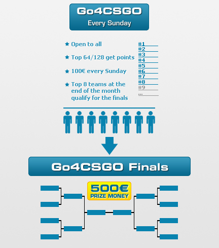 51 [MAJ] La première édition des Go4CSGO débutera finalement dans une semaine, soit le dimanche 8 juillet aux alentours de 14h. De grosses écuries semblent intéressées par ce concept et pourraient bien y participer. Si vous voulez vous inscrire, la page du signup est disponible ici. Sachez également que cela ne sert à rien de vous inscrire si vous n'avez pas de clé CS:GO. Nous couvrirons ces compétitions chaque semaine et fournirons plus de détails bientôt dans la partie coverage.