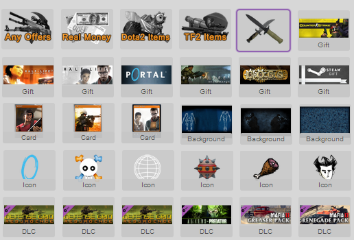 Vous pouvez échanger autre chose que de simples skins. Vous pouvez échanger des jeux (Steam gift), des cartes Steam, des backgrounds Steam, des DLC et même des émoticones pour conversation Steam. Certains icones sont également disponibles pour proposer des offres moins précises.