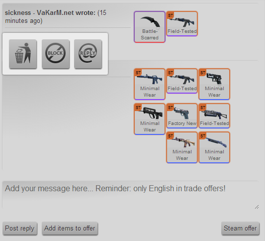 Pour gérer les offres qui vous ont été faites, il vous suffit de passer le curseur de votre souris sur la zone de l'offre. Trois icones apparaitront. Le premier est une poubelle et sert à signifier que l'offre ne vous satisfait pas, la zone devient grise et se désactive. Le second sert à bloquer quelqu'un qui vous aurait fait plusieurs offres non satisfaisantes par exemple, il ne pourra plus répondre à vos offres tant que vous ne le débloquez pas. Et le troisième bouton sert a répondre à une offre précise, vous pouvez alors écrire un message et donc négocier le trade (exemple : okay if you add) ou signifier à votre interlocuteur que son offre vous convient (exemple : ok add me ou added).