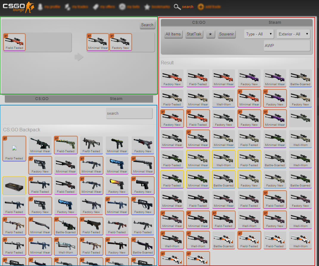 Le site vous permet également de cherche un trade et des items précis, cela se passe dans le menu principal en haut du site avec le bouton "search". Quand vous cliquez dessus, vous tombez sur une page quasi identique avec celle de "Add Trade". Dans le screen ci-dessous, nous recherchons par exemples certains modèles d'awp contre notre modèle d'awp.