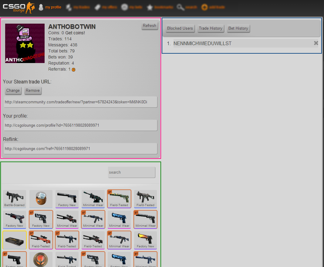 Dans la partie des infos de votre profil, vous pouvez ajouter le lien pour recevoir un trade à distance, le bouton "refresh" permet de rafraichir les données de votre profil, y compris votre inventaire (pas immédiat pour l'inventaire). Dans la partie droite, vous pouvez afficher les utilisateurs bloqués avec "Blocked Users", vous pouvez aussi voir vos anciennes offres dans "Trade History" et vos anciens paris dans "Bet History".