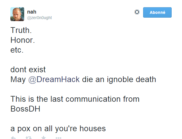 L'affaire qui a éclaté au grand jour aujourd'hui va faire beaucoup de bruit. Robert Ohlen, démis de ses fonctions à un mois de la DreamHack Winter 2014, n'a pas été tendre dans ses différents tweets dont celui-ci en particulier :