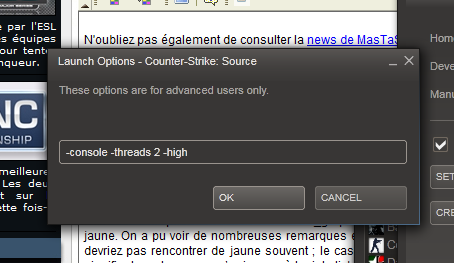 - Il existe deux autres commandes possibles, dans les options de lancement de CSS cette fois-ci : -threads X (avec X en général supérieur ou égal à 2, à vous de tester) et –high pour mettre le jeu en priorité haute. Pour les possesseurs de Core 2 Duo, -threads 4 semble être le meilleur choix d'après les retours de joueurs. Attention pour le -high, pour de nombreux joueurs il semble créer de nouveaux problèmes : sensi modifiée, montée de ping, voir crash. Ces phénomènes peuvent s'expliquer, mais il est difficile de savoir à l'avance si vous les rencontrerez. Si vous rencontrez ces types de problèmes, il est conseillé d'enlever le -high des options de lancement.