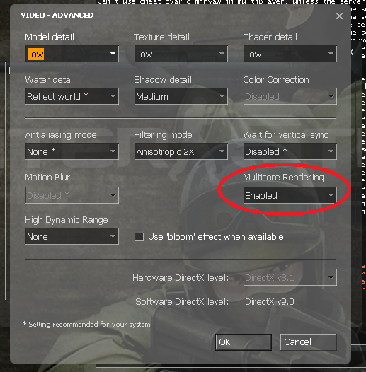 - On peut beaucoup lire sur le net d’utiliser la commande mat_queue_mode à 2. A priori, si vous activez le multicore rendering, cela ne devrait rien changer, -1, la valeur par défaut et 2 semblant identique quand l’option donnée plus haut est cochée. Ca se vérifie facilement avec le vidéo stress test, j’obtiens quasiment les même FPS (à 1 ou 2 près) avec mat_queue_mode à -1 ou 2.
