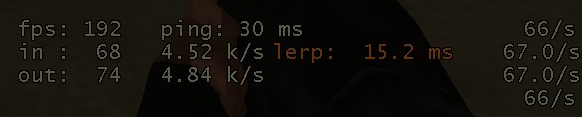La valeur « lerp » est visible avec le net_graph 1. Elle peut parfois s’afficher en blanc, orange ou jaune. On a pu voir de nombreuses remarques et conjectures sur la « meilleure couleur ». Vous ne devriez pas rencontrer de jaune souvent ; le cas échéant vous devriez changer de serveur, le jaune signifiant que le serveur n’arrive pas à tenir le tickrate (framerate en réalité) demandé.