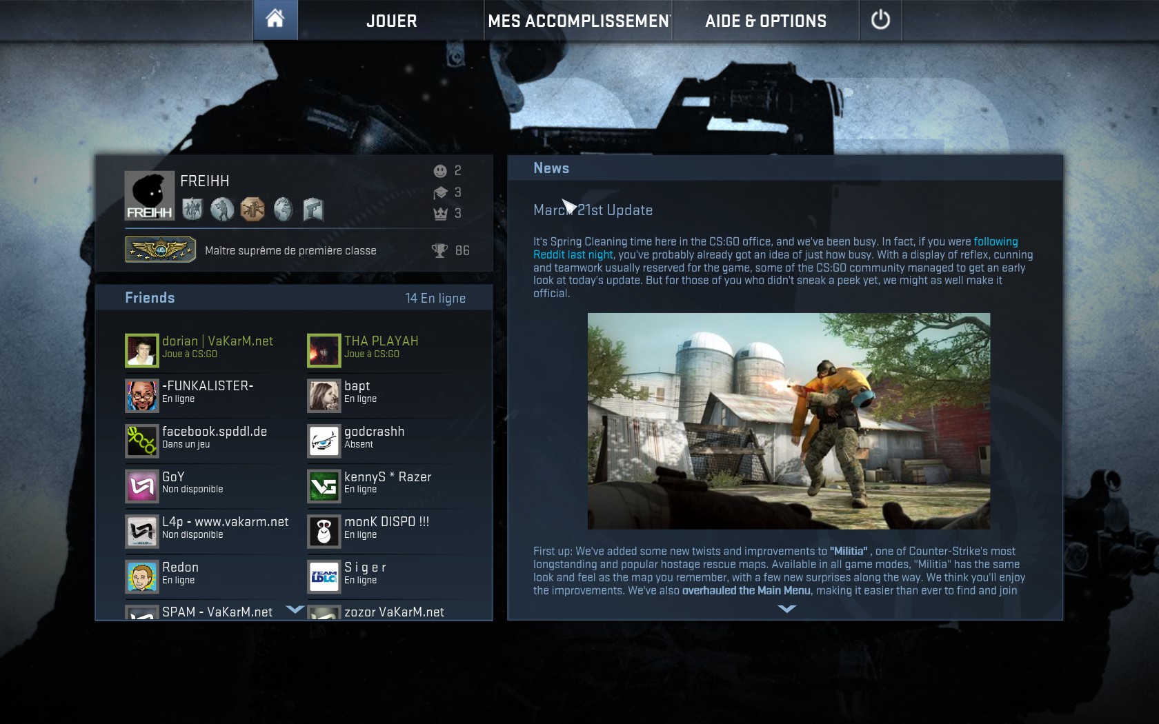 Le menu principal de CSGO a été modifié, le rendu est plus propre et met en avant les Amis Steam, il y a néanmoins quelques soucis avec l'affichage de la console, visiblement le fonctionnement est assez aléatoire.