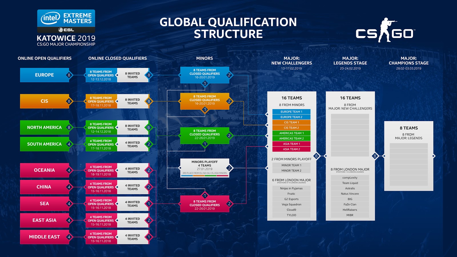Sauf qu'entre temps, Valve a voulu se montrer soit plus sévère, soit plus attentif aux souhaits de la communauté : en effet, elle a décrété que les 2 formations qui finiraient dernières du New Legends Stage ne seraient pas réinvitées au New Challengers Stage du Major suivant, et qu'elles devraient donc repasser par les Minors. Au dernier Major, ce sont donc mousesports et Winstrike qui ont fait les frais de cette nouvelle règle. Avec cette annonce, le nombre d'équipes issues des Minors passait donc de 8 à 10, tandis que le nombre de formations attendant pour démarrer le New Challengers Stage tombait donc de 8 à 6. Cette année, les 6 formations s'armant de patience sont fnatic, NiP, G2, Cloud9, TYLOO et Vega Squadron. Le format des Minors, de ce fait, s'en trouvait modifié.