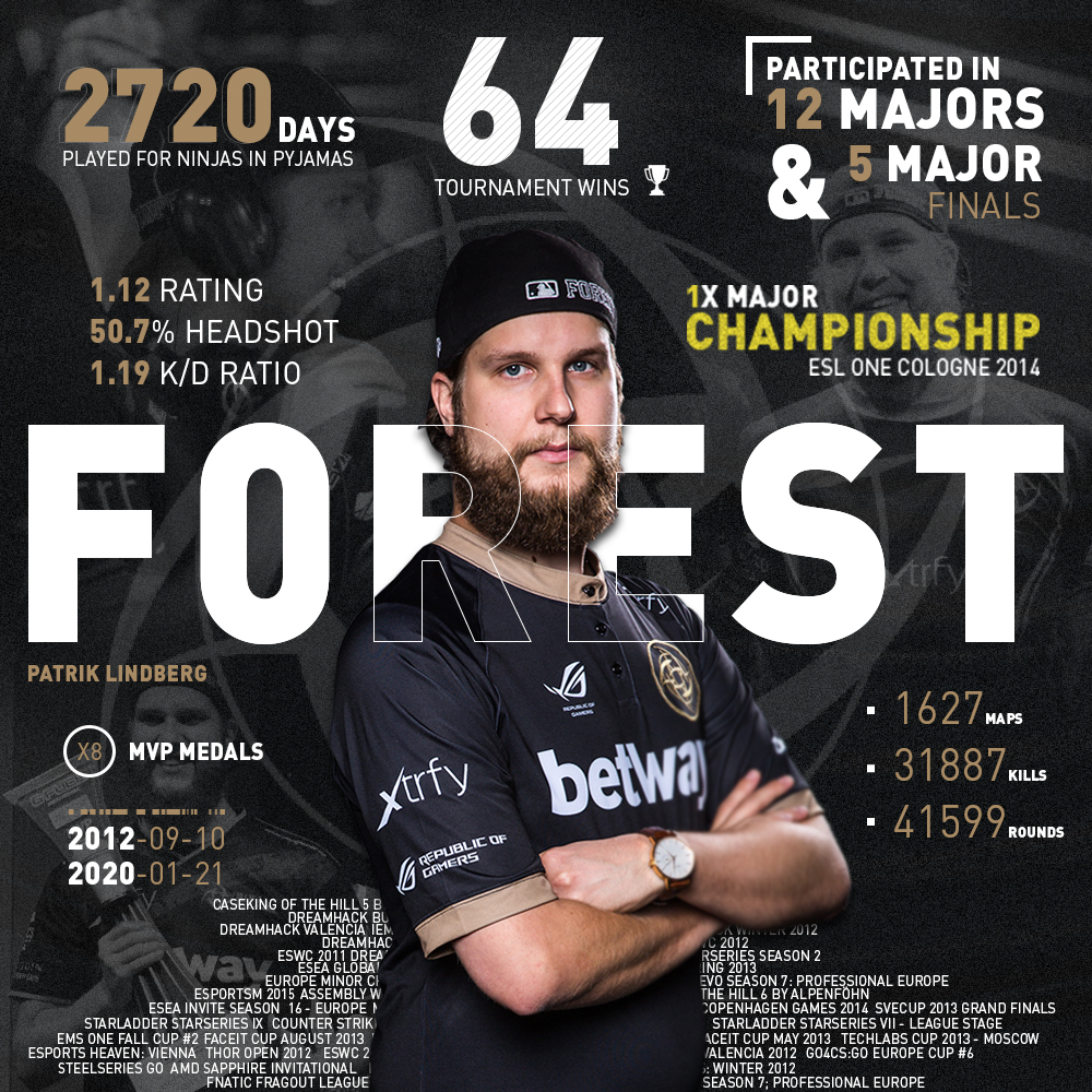 Que dire de f0rest si ce n'est que sa longévité est sans égale sur Counter-Strike, qu'il aura traversé la décennie 2010 comme un seigneur, cumulant les trophées et les récompenses individuelles avant d'être bien souvent l'un des seuls à surnager chez NiP lorsque le collectif commença à montrer des signes de fatigue. Ce qui explique sans peine pourquoi il était toujours dans la line-up suédoise à 31 ans passés, quand tous ses compères générationnels avaient généralement décroché du haut niveau depuis longtemps.
