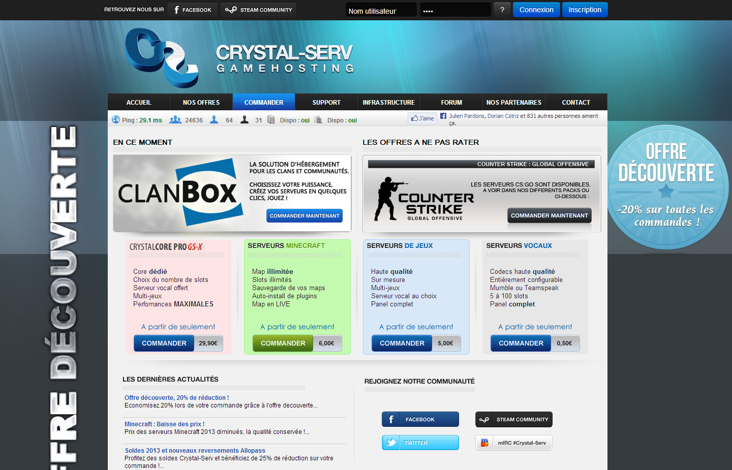 13 En septembre notre site passait la vitesse supérieure en sortant sa nouvelle version, plutôt bien accueillie au passage. Aujourd'hui c'est au tour de Crystal-Serv, société de location de serveurs de jeux et sponsor de notre association, de faire peau neuve avec en ligne de mire des changements majeurs, aussi bien esthétiques que fonctionnels.