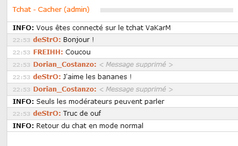 Continuons le focus sur ce tchat : les modérateurs seront distinguables grâce à la couleur orange des pseudos, l'utilisateur normal ayant une couleur bleu. Comme vous le voyez sur la capture d'écran, des outils de modération automatique sont en place et d'autres sont déjà codés et prêts à devenir fonctionnels si besoin. Pour l'instant on mise sur le fait qu'un compte VaKarM soit nécessaire sur le tchat pour responsabiliser tout le monde. Si vous n'êtes pas connecté, des liens seront proposés, idem pour l'inscription.