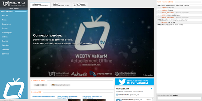 Cette page contient une petite révolution pour VaKarM : fini le channel IRC #vakarm pour la TV, l'interaction entre l'équipe de streaming et vous passera désormais par le tchat intégré au site. Beaucoup plus pratique pour les utilisateurs, également plus visible et accessible, on espère qu'il conviendra à tout le monde.