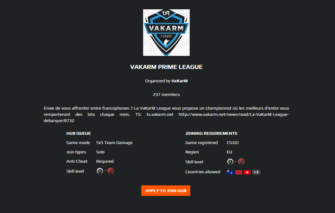 La période de classement vient tout juste de se terminer et les 250 meilleurs joueurs de la Mid League ont été promus en Prime League. Dorénavant, chaque premier du mois (qui marque aussi le début d’une nouvelle saison), les 50 derniers joueurs de la Prime League seront remplacés par les 50 premiers de la Mid League. Afin d’éviter les erreurs et oublis, il est de votre responsabilité de demander l’invitation en Prime League si vous êtes éligible à chaque début de saison. C’est très simple : il vous suffit d’aller ici, de cliquer sur « VaKarM Prime League » puis sur « Apply to join HUB ». Votre éligibilité sera ensuite contrôlée rapidement.