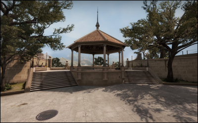 L’objectif de Volcano avec ce couloir épique était d’inclure des éléments de verticalité comme on en trouve sur des maps telles que Nuke – une verticalité qui s’étend sur tout le passage jusqu’au site B, sans créer des situations étranges où 2 joueurs se retrouveraient l’un au-dessus de l’autre. Le chemin menant à cette terrasse en hauteur était un challenge : bien que nous voulions de la verticalité, la conséquence de créer une zone surélevée est qu’elle rend les zones aux alentours inutiles et obsolètes. Notre "pigeonnier" devait avoir des inconvénients et des limitations pour rendre le chemin au rez-de-chaussée viable. Au fil du temps, on a ajouté une fente au-dessus de l’entrée des terroristes menant à ce chemin, qui leur permettrait d’attaquer en équipe en coordonnant leur smoke et flash pour bloquer la visibilité des CT (qui ont une ligne d’awp idéale). Bien plus tard dans le processus de développement, on a ajouté un chemin dans la zone communément appelée "armurerie". On a remarqué que les joueurs avaient des difficultés à reprendre le site à cause du nombre limité d’entrées, et cette route additionnelle a atténué le souci, en faisant de l’armurerie une zone cruciale pour contrôler le site bombe. L’éditeur de niveau