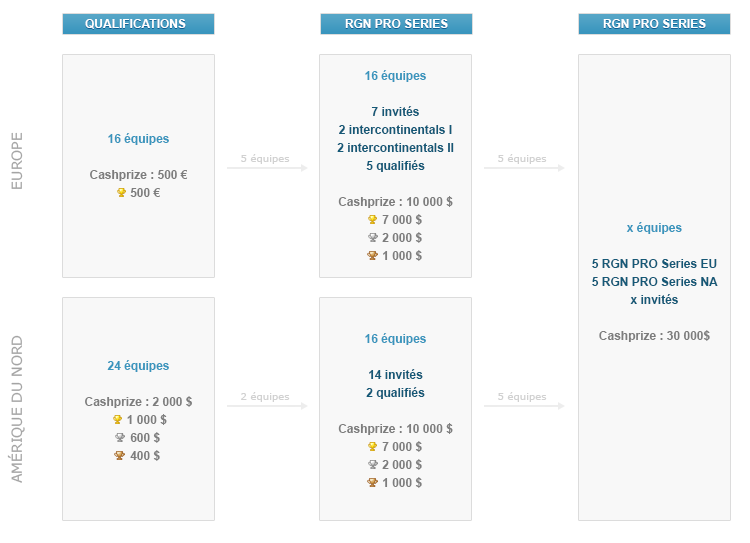 Malgré le fait que les qualifications ne soient toujours pas terminées et que les ligues n'aient pas encore débuté, RGN vient d'annoncer un nouveau championnat appelé RGN Pro Series Championship regroupant les futures meilleures équipes de ces ligues et doté de 30 000 $. Les cinq meilleures formations américaines et européennes accèderont à ce championnat où elles seront rejointes par des équipes invitées par l'organisation. Si nous ne connaissons pas encore la répartition du cashprize, les noms des équipes invitées et le format, nous savons d'ores-et-déjà que cette nouvelle compétition sera jouée en LAN, mais le lieu est lui aussi inconnu pour le moment.