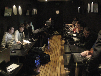 Lorsque nous arrivons dans la salle des matchs au dernier niveau accessible du bâtiment (qui se présentait sur un plan vertical donc pas forcément très pratique d'utilisation au final), je rencontre l'apach et KenoB, qui nous expliquent que l'on peut d'ores et déjà s'installer.
