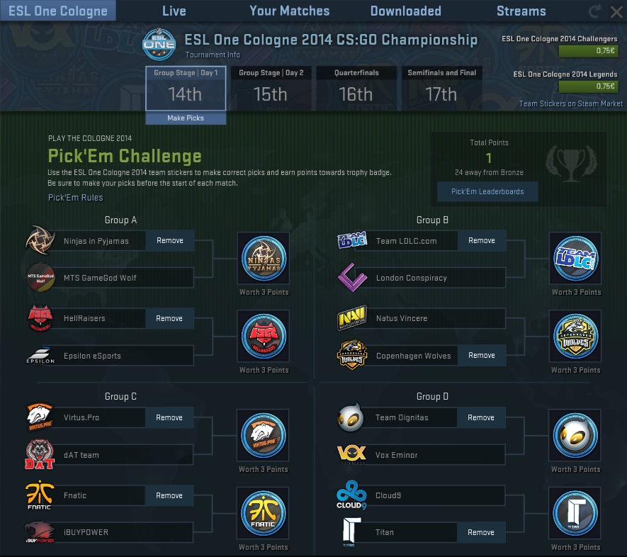 1- Les revenus de Cologne vont etre BIIIEN plus gros pour les stickers parce que a)y'a plus de joueurs de csgo aujd b) les stickers de Katowice valent une fortune maintenant sur le marche alors ca va speculer a fond sur ceux-ci. 2- Le mec qui a fait le screen de PickEm All avec ses predictions s'est plante sur HR vs Epsilon (epsi win) et CW vs NaVi (Navi win) sinon je suis d'accord avec lui ;-) 3 - Sinon vous en pensez quoi de la gueule des nouveaux stickers ? Je trouve le rond bleu assez moche - je prefere ceux de Katowice.