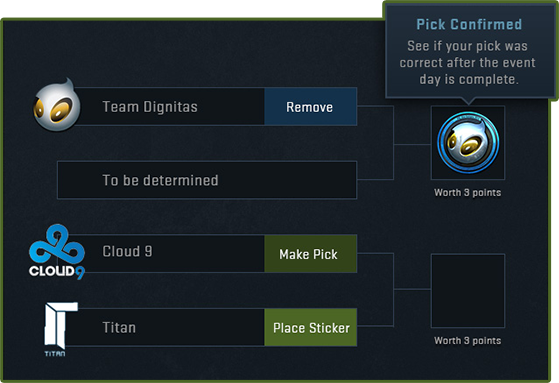 105 Comme pour Katowice, les stickers sont de retour et comme toujours Valve doit apporter quelque chose en plus à chaque événement. Cette fois-ci le quelque chose prend la forme d'un jeu autour des pronostics sur chaque match : le Pick'Em Challenge. Le but est de renforcer le lien entre les joueurs et les pros, aider financièrement les structures et bien sûr faire du profit.