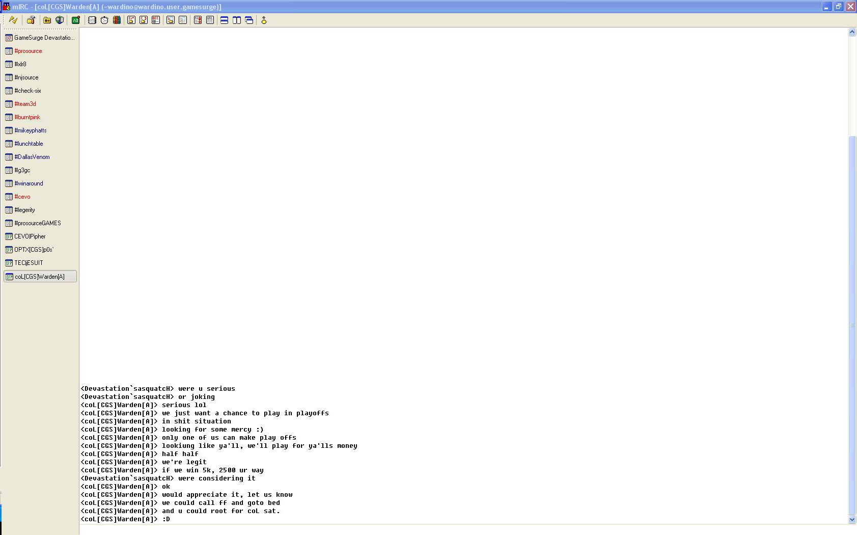 Devastation `sasquatcH> t'était serieux Devastation `sasquatcH> ou tu plaisantait coL[CGS]Warden[A]> serieux lol coL[CGS]Warden[A]> on veu juste une chance de jouer au playoff coL[CGS]Warden[A]> "dans une situation de me***" (?) coL[CGS]Warden[A]> on "cherche" un peu de "pitié" coL[CGS]Warden[A]> seulement l'un d'entre nous (l'une de notre team?) peut faire les playoff coL[CGS]Warden[A]> on cherche comme vous, on joura pour l'argent de tous (?) coL[CGS]Warden[A]> moitié moitié coL[CGS]Warden[A]> on est cool coL[CGS]Warden[A]> si on gagne 5000, 2500 pour vous Devastation `sasquatcH> on y pensera coL[CGS]Warden[A]> ok coL[CGS]Warden[A]> "j'aprecis", tien moi au courant coL[CGS]Warden[A]> on peut appeler "ff" et aller au lit coL[CGS]Warden[A]> and you could root for coL sat. (???) coL[CGS]Warden[A]> :D