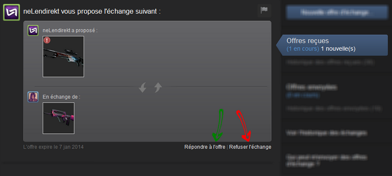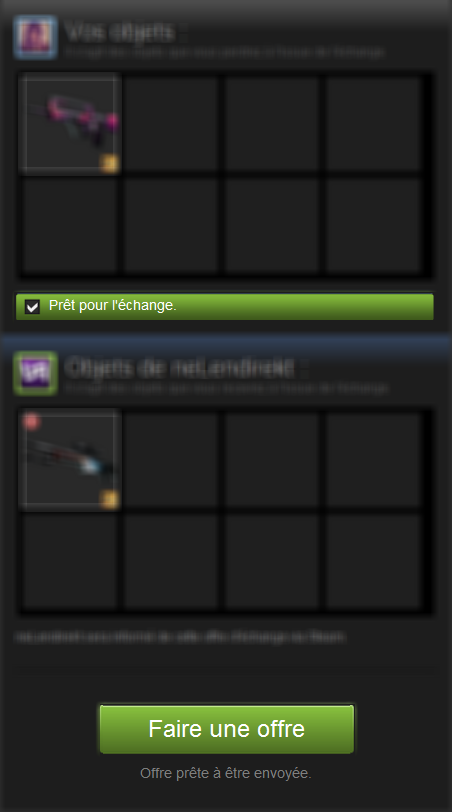 La méthode du profil nécessite d'être ami avec le joueur concerné. La méthode de l'inventaire se fait par le biais d’un lien d’échange à distance (voir fin de page pour comment avoir son lien). Le principe des deux méthodes est identique à une demande d’échange basique sauf que cette fois-ci vous devez aussi choisir les armes de votre interlocuteur. Une fois les objets choisi des deux côtés, il vous suffit de cliquer sur "Cliquez ici pour confirmer le contenu de l’échange." puis "Faire une offre".