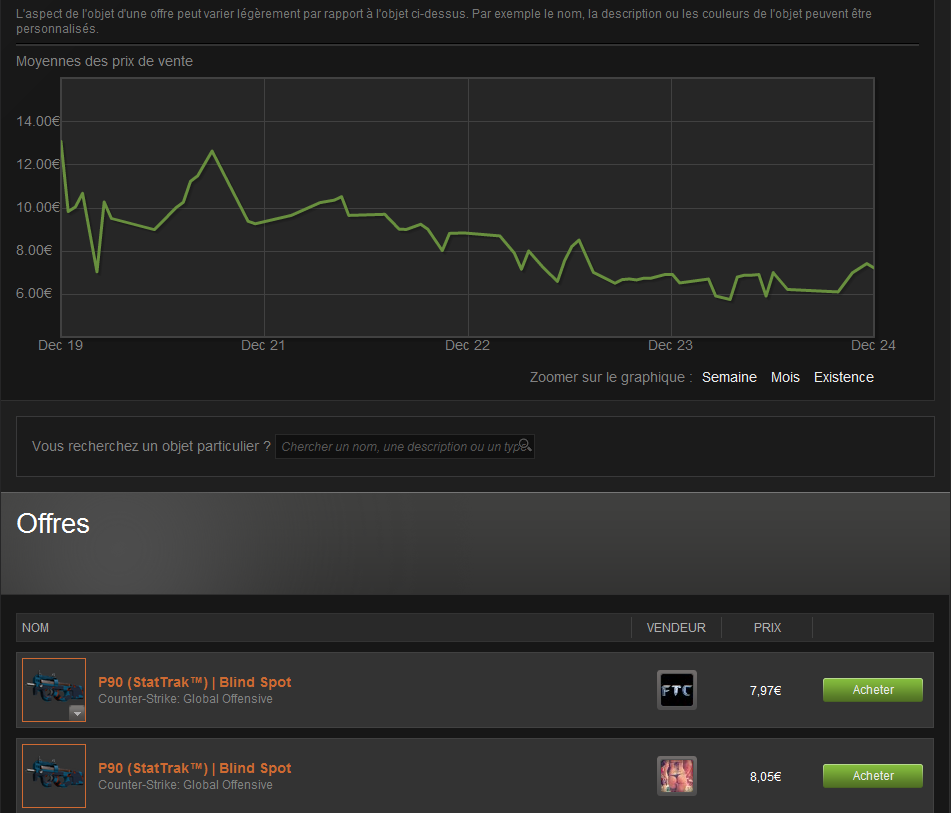 Après avoir choisi votre modèle, vous serez redirigé vers la page détaillée. Cette dernière comporte une description plus précise de l’arme, une courbe représentant le prix moyen de vente par le passé et enfin toutes les armes correspondant au modèle (arme et qualité) triées par prix en ordre croissant. Le moins cher est donc en haut de la liste.