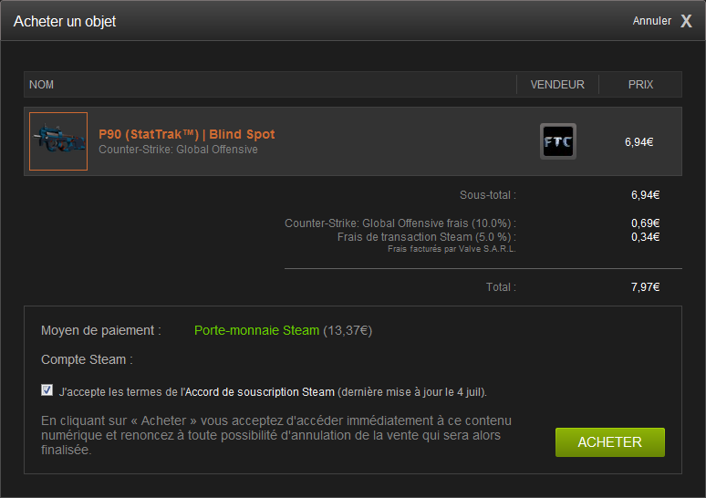 Le détail du prix est précisé. Ainsi, ce skin rapportera de l'argent à son propriétaire, à Valve et à CS:GO. Cela est valable pour toutes les transactions. Par exemple, ici pour un achat de 7,97 €, le vendeur va recevoir 6.94 €, CS:GO 0.69 € et Steam 0.34 €.