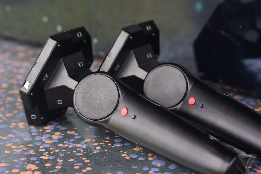 En revanche, là où les autres casques se contentent de capteurs du type accéléromètre et gyroscope pour détecter les mouvements, le Vive est doté d’un système dédié beaucoup plus poussé. Pour jouer avec le Vive, il vous faudra avant toute chose déterminer un espace de jeu dans votre salle. D’après un ingénieur d’HTC à qui j’ai pu poser plusieurs questions, l’espace dans lequel vous pouvez jouer s’étend de 1m x 1m (1m²) à 4m x 5m (20m²). Vous devrez ensuite placer à 2 coins de votre espace de jeu un dispositif de détection. Le casque que vous portez pourra alors se localiser dans l’espace, et ceci dans toutes les directions. Vous êtes même équipé de 2 manettes dont la forme vous fera peut-être penser à celle d’une Wiimote. Ces manettes sont elles aussi positionnées dans l’espace, toujours grâce aux 2 dispositifs dans les coins de votre salle.
