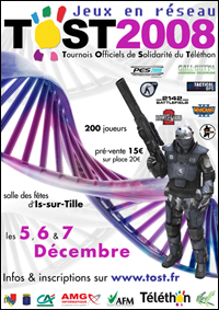 10 Une occasion pour vous "gamers" de jouer pendant un week end tout en soutenant une bonne cause ; les inscriptions seront intégralement reversées au Téléthon 2008. Alors si vous n'aviez rien prévut le week-end du 5-6 décembre et que vous vous trouvez dans le coin, rendez-vous à Is-sur-tille (Bourgogne). Bon esprit et ambiance garantie autour de différents tournois tels que CS:Source, COD4, PES ou Warcraft3.