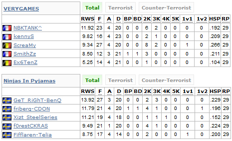 Les rounds se sont ensuite enchainés rapidement et les francophones n'ont plus jamais été en mesure de remporter un round. L'anti-stratégie opérée par les Ninjas in Pyjamas a marché parfaitement à l'image du placement de GeT_RiGhT sur certains rounds, derrière le MAC. A l'image du score de NBK sur ce second side et malgré un premier extraordinaire, VeryGames n'a pas réussi à mettre un seul round. 0-8, 0-10 et finalement 0-14 ! Les Ninjas in Pyjamas enflamment les réseaux sociaux en remontant un match qui semblait plié. Un 16-13 et une enième victoire consécutive pour les Sudéois qui confortent ainsi leur première place du classement de la saison régulière.