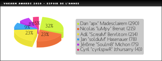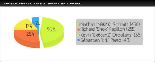 On s'y attendait tant ses performances sur l'année 2010 sont montées en flèche ! NBKKK remporte l'Award du meilleur joueur avec la moitié des suffrages. Son intégration chez VeryGames en remplacement de crZ était un pari risqué puisqu'il n'avait alors pas beaucoup d'expérience. Mais il aura en quelques mois et quelques lans montré qu'il était indispensable à l'équipe. Stable, serein et décisif lorsqu'il le faut, si la formation française est devenue ce qu'elle est aujourd'hui, c'est bien en grande partie grâce à son joueur le plus jeune !