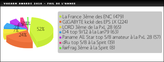 Tout le monde y croyait, peut-être les joueurs eux-mêmes un peu trop. Tout le monde pensait que cette année était la bonne pour l'équipe de France en ENC. Raté ! Une défaite en demi-finale face au Danemark et les ambitions s'écroulent. L'honneur est sauvé grâce à une victoire en petite finale sur les Allemands, mais tout de même, quelle déception ! C'est la raison pour laquelle l'Award du fail va à l'équipe de France qui devra se remotiver en 2011 ! A côté de ça, le kick des GIGABYTE en EPS a également marqué les esprits. Les filles voulaient montrer de quoi elles étaient capables, mais avant cela, il aurait fallu respecter les règles. Dommage.