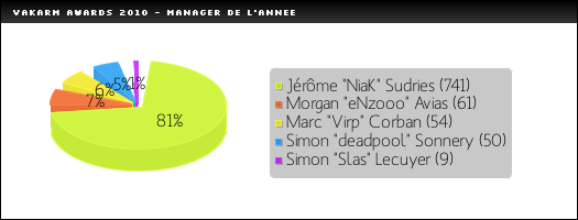 Sans hésitation aucune, c'est bien Jérôme "NiaK" Sudries, le manager de la structure française VeryGames qui remporte ce titre. Une présence au quotidien autour de ses joueurs et une communication maitrisée avec les médias ont sans aucun doute bien aidé la formation à s'imposer en tant que référence en France et en Europe. Une personne investit dans ce qu'elle fait, et un profil bénéfique au sport électronique. Un type de profil d'ailleurs trop peu présent dans ce domaine.