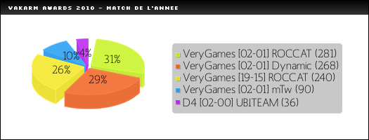 Sur ces cinq grandes rencontres, trois sont sorties du lot. Dans l'ordre, VeryGames contre ROCCAT en demi-finale de la Gamers Assembly, VeryGames contre Dynamic en demi-finale winner bracket de la DSRack 3 et enfin encore un VeryGames contre ROCCAT en finale winner bracket de la Lan79. C'est grâce à quelques votes supplémentaires que le match de la Gamers Assembly remporte cet Award. Une opposition d'anthologie, pleine de tension, qui a marqué la chute de ROCCAT et la prise du pouvoir par VeryGames.