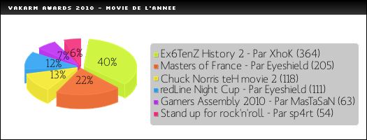 Vous êtes nombreux à suivre d'un oeil attentif les sorties vidéo sur notre site. Malgré une année plus pauvre qu'à l'accoutumée, quelques réalisations ont su sortir du lot. Et c'est ici Ex6TenZ History 2 de XhoK qui a su recueillir le plus de suffrage pour remporter l'Award. Derrière, c'est Eyeshield qui fait également un bon score avec sa récente movie sur les finales des Masters.