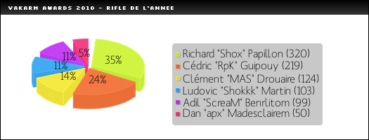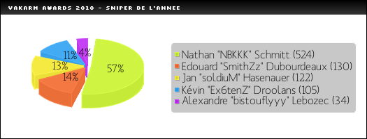 Et c'est le doublé ! Meilleur joueur, mais également meilleur sniper donc ! NBKKK a su s'imposer en tant que sniper chez VeryGames et a rivalisé en France et en Europe avec les plus grands joueurs awp. SmithZz, KRAEUTERHUMPEN, azk, RattlesnK ... pour ne citer qu'eux, le petit joueur français n'a vraiment rien à leur envier. On notera un bon score pour soldiuM, qui devra confirmer son statut de joueur montant en 2011.