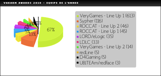 La liste était longue, mais il était difficile d'écarter certains noms tout en laissant d'autres. Vous aviez donc un large choix. Sans surprise, c'est VeryGames dans sa version Ex6TenZ, NBKKK, Shokkk, RegnaM et RpK qui remporte l'Award de la meilleure équipe. Une domination française, européenne et *enflammons-nous* mondiale, suite à la DSRack 3. Rien n'a résisté à ces cinq-là ! Bravo. A noter que ci-dessus, la line-up 1 de ROCCAT est représentée par krL, MAS, luMpy, RpK et SmithZz tandis que la 2ème est celle de krL, mateOo, mK, RpK et SmithZz. La formation numéro 2 de VeryGames était composée quant à elle d'Ex6TenZ, Shokkk, NBKKK, RegnaM et victorztw.
