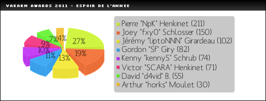 NpK, voilà le nom du joueur espoir de 2011. Remarqué par ses performances avec PyRoGeN, certains disent même qu'il puise son skill dans ce fameux pseudo de trois lettres, si cher à bon nombre de joueurs. Il faudra confirmer en 2012 et passer un cap pour faire partie de l'élite française.