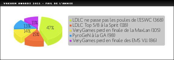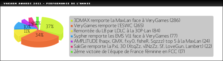 L'attribution de la meilleure performance a été plus indécise avec un réel combat entre 3DMAX à la MaxLan et VeryGames à l'ESWC. C'est finalement la première équipe qui s'impose, sans doute à cause de ce résultat plutôt inattendu à la base. VeryGames aurait toutefois certainement mérité un autre sort pour cet award. Dommage ...