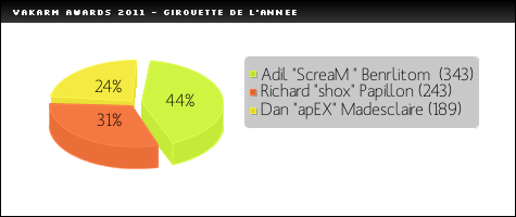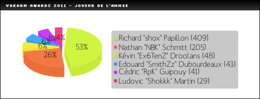 Nominé chaque année depuis 2008, il n'avait jamais remporté ce titre. shox détrône NBK de manière assez nette. Ces performances chez 3DMAX puis chez VeryGames auront certainement marqué les esprits.