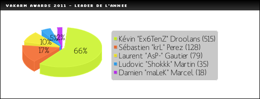 C'est l'une des plus larges victoires sur ces nominations, Ex6TenZ l'emporte haut la main. Leader chez VeryGames depuis octobre 2009 il a depuis toujours mené ses hommes vers le haut, pour tenter de glaner tous les trophées. 2011 a été l'une de ses plus belles années avec une victoire à l'ESWC en finalité. L'année 2012 sera-t-elle aussi fructueuse ?