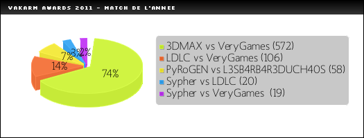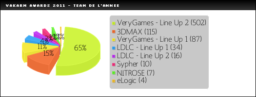 Sans la moindre surprise, c'est la formation VeryGames version shox qui remporte le titre de meilleure équipe française de l'année 2011. Aucun match perdu avec cette line-up, à se demander même s'ils n'étaient pas TROP forts. La victoire à l'ESWC a été la consécration. Mais une nouvelle ère nous attend sans doute maintenant.