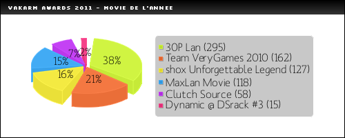 2011, bon cru côté moviemaking avec de belles réalisations notamment françaises. Et cocorico, c'est notre MsTsN qui l'emporte avec sa 30P Lan movie qui avait reçu de nombreuses éloges lors de sa sortie. Une réalisation longue et épurée, mais remplie de footage lan d'une rare qualité. On en redemanderait presque.