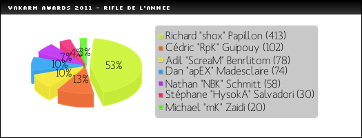 Deuxième titre pour shox. Il écrase littéralement la concurrence pour l'Award du meilleur rifle en récupérant plus de la moitié des votes et lorsque l'on voit la liste des pseudos qui le suivent, ce n'est pas rien. Décisif chez 3DMAX, il a ensuite renforcé la formation VeryGames, qui aura véritablement alors roulé sur le monde entier en sa compagnie.