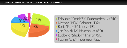 SmithZz s'impose en tant sniper de l'année 2011 ! Déjà vainqueur en 2008 et 2009, le revoilà sur la plus haute marche. Comme pour l'Award du meilleur joueur, NBK perd là encore son titre, qui finit même second de justesse puisque flex0r, grâce à une excellente MaxLan où il avait fait parler la poudre en grande finale face à VeryGames, a fait un très joli score.