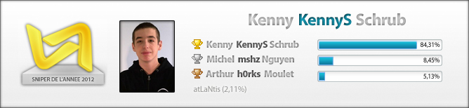 | Première année et première victoire avec presque 85% des voix pour kennyS. Quasiment inconnu l'an passé, le sniper originaire de Digne s'impose qui plus est comme l'un ou le meilleur sniper européen et mondial sur le nouvel opus de Valve. Véritable surprise début 2012 avec eXtensive sur Source, il aura rejoint VeryGames au moment le plus opportun pour sa carrière. Quelques fois rappelé à l'ordre pour sa fougue et son manque d'expérience, il compense cependant avec une précision et une rapidité d'exécution qui font de lui un joueur incontournable de la scène. |
