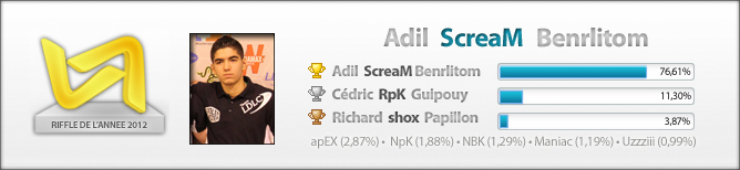 Et c'est le doublé pour ScreaM ! Tout comme pour le sniper de l'année, Adil a écrasé la lourde concurrence pour récolter plus de trois quarts des suffrages et remporter le prix de riffle de l'année. Que ce soit avec une AK, un deagle ou une M4, l'ancien imG est une machine et enchaine les headshots avec une facilité déconcertante. Le duo RpK/shox qui impressionne depuis des années sur Source n'aura pas tenu la comparaison avec le Belge sur ce début de CSGO. |