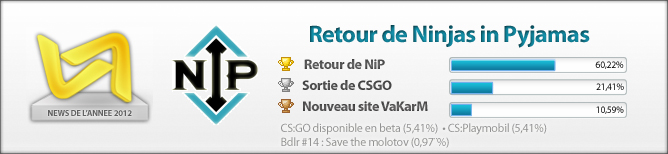 | Un tag légendaire, dans une équipe comportant des joueurs d'exception et managé par une des légendes d'1.6. Le retour de NiP aura pour vous marqué cette année 2012. Peut-être même l'évenement qui marque le début du dernier opus de Valve, puisque ce sont eux qui ont entrainé les autres joueurs dans la spirale CS:GO, ce sont eux les premiers à avoir cru dans le jeu et surtout à s'engager dans cette aventure. Les ninjas ont pris le jeu au sérieux et aujourd'hui force est de constater que ce choix si précoce a certainement joué en leur faveur pour devenir l'équipe n°1 mondiale. |